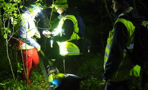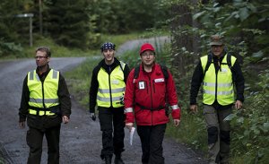 Kymmenen jälkeen metsään lähti Eeva Kaatajan ja Bono-koiran vetämä partio tarkistamaan toiselta partiolta saatua vinkkiä. Metsässä oli jo kuljettu jonkin verran, joten jalkapartioiden jättämät jäljet hämmensivät. Vahva ilmavainu kuitenkin johdatti Bonon viimeisenkin kadonneen luokse noin kuusi tuntia harjoituksen alun jälkeen.