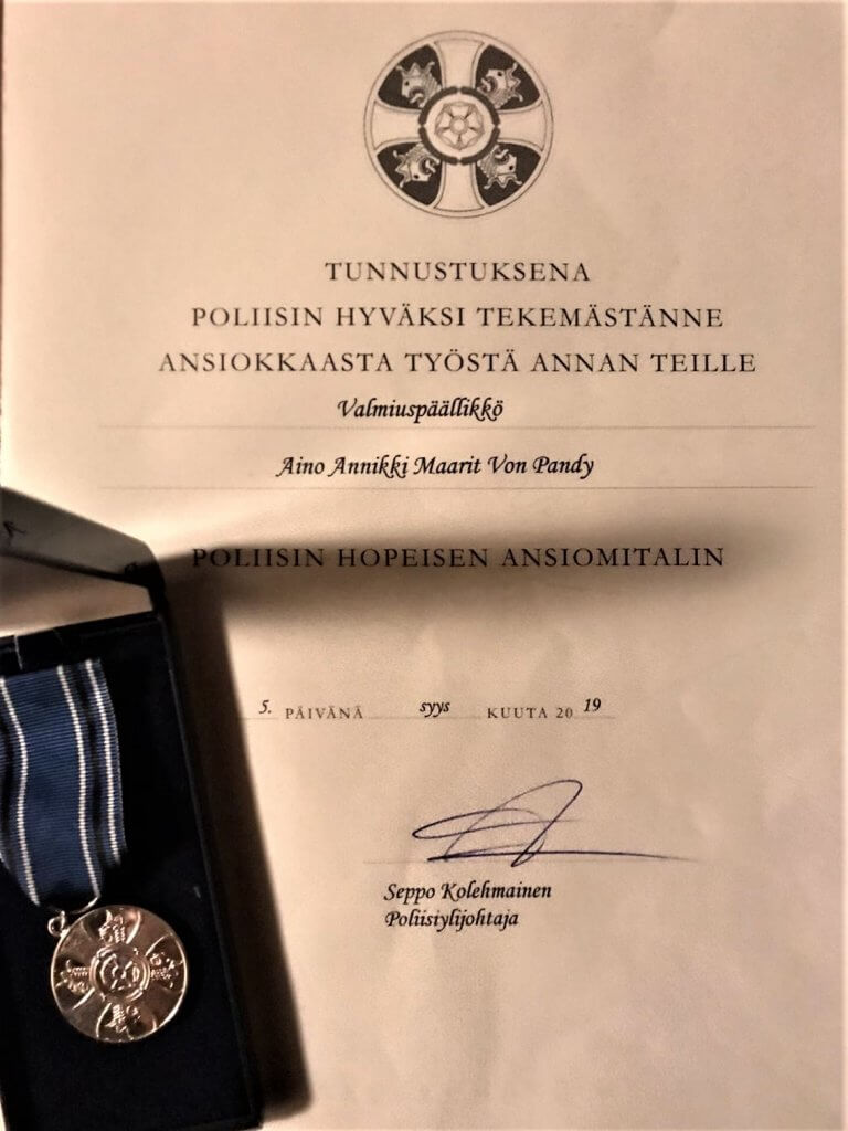 Suomen Punaisen Ristin Lapin piirin valmiuspäällikkö Annikki von Pandy palkittiin poliisin hopeisella ansiomitalilla tunnustuksena poliisin hyväksi tehdystä ansiokkaasta työstä.