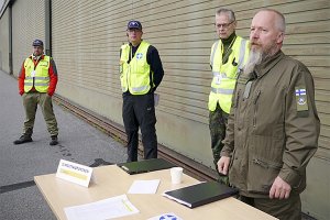 Juhani Alkio pitämässä ILMI17 -harjoituksen alkupuhuttelua. Taustalla Jarmo Ojajärvi, Aki Valonen ja Tero Mustonen. Kuva: Jouko Liikanen