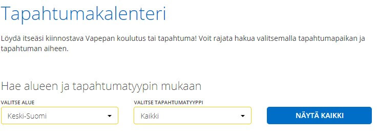 Vapepan tapahtumakalenterissa on nyt runsaasti tapahtumia jo pelkästään Keski-Suomen alueella. Tässä luettelo tapahtumakalenterissa olevista tapahtumista kun luettelon valinnaksi on asetettu Keski-Suomi (tilanne 19.2.2020).