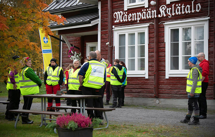 Kauhavan kurssilaiset Mäenpään kylätalon pihassa. Oikealla Marko Järvenoja ja Suvi Linjamäki.
