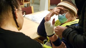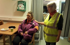 Vapaaehtoinen etsijä saa ensiapua Vapepan johtopaikalla. Kuva Päivi Kokkonen, Vapepa Joensuu pkt