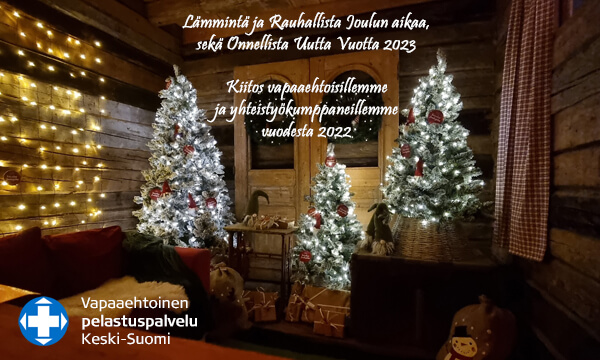 Vapaaehtoinen pelastuspalvelu, Vapepa Keski-Suomi kiittää vapaaehtoisiaan, kaikkia yhteistyökumppaneitaan ja tukijoitaan kuluneesta vuodesta 2022. Teimme yhdessä merkityksellisiä tehtäviä yhdessä lähimmäistemme auttamiseksi. Toivotamme Lämmintä ja Rauhallista Joulun aikaa, sekä Onnellista Uutta Vuotta 2023! Kuva: Joulupukin Tupa, Toivolan vanha piha, Jyväskylä, 2022. Kuvaaja ja kuvan muokkaus Heikki Maukonen. Lue lisää